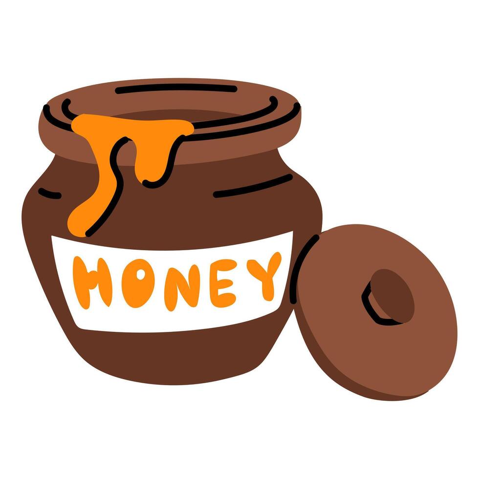 In a clay container with honey. An open clay pot with a lid and a signature. A separate illustration for the dish. The taste of honey, an ingredient for adding to dishes. Flat illustration honey Pro Vector