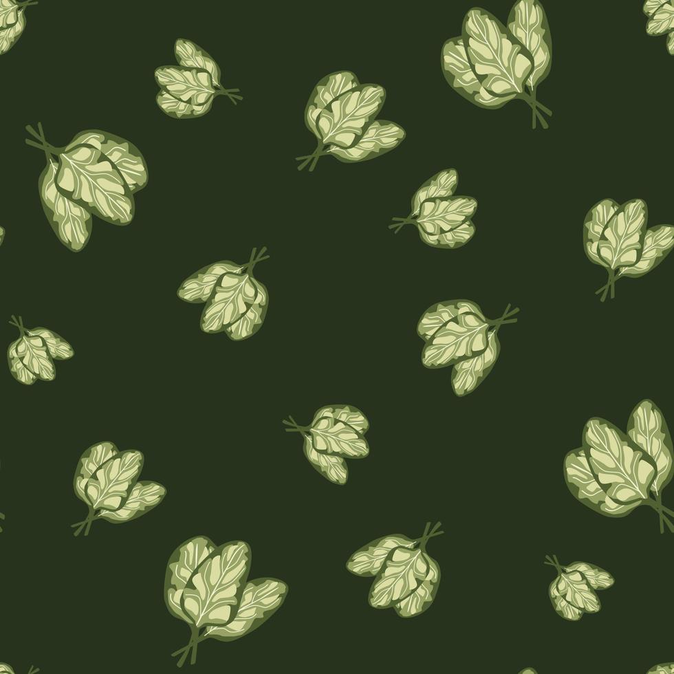 Seamless pattern bunch spinach salad on dark green background. Simple ornament with lettuce. Pro Vector