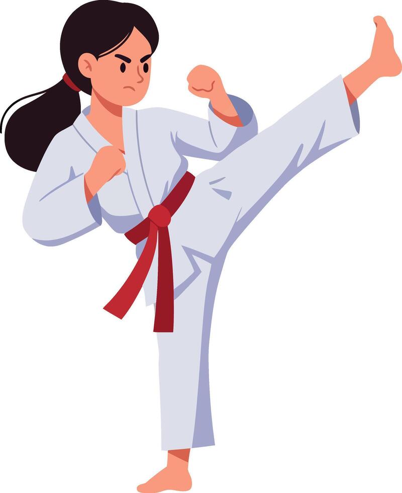 Karate practitioner in action, flat design, displaying strength and focus in dynamic pose, illustration Pro Vector