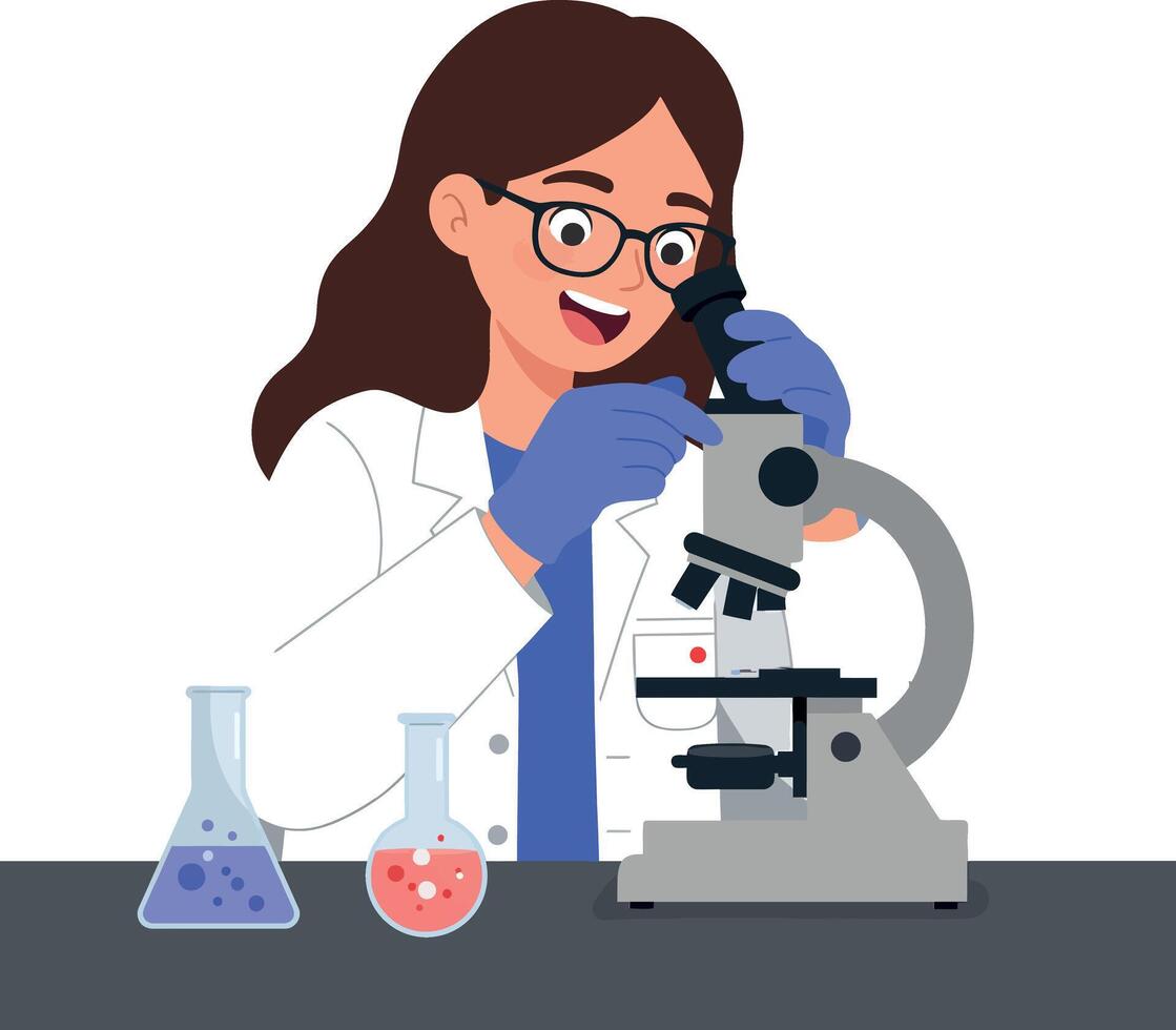 Scientist examining samples with microscope in flat style art illustration Pro Vector