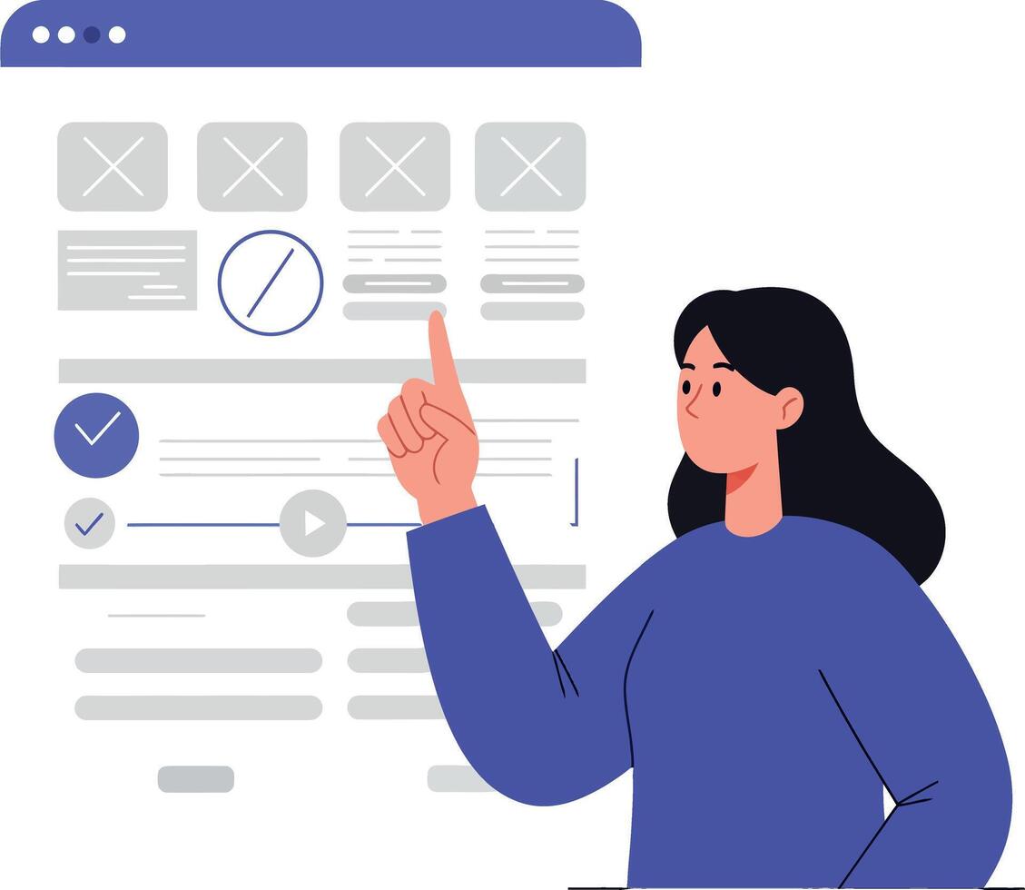 Woman interacting with digital interface displaying various elements and selections Pro Vector