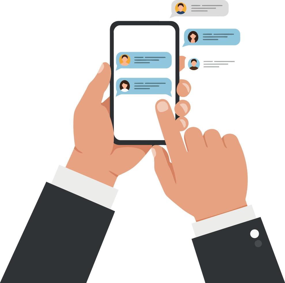 Hands holding smartphone while interacting with messaging application interface Pro Vector
