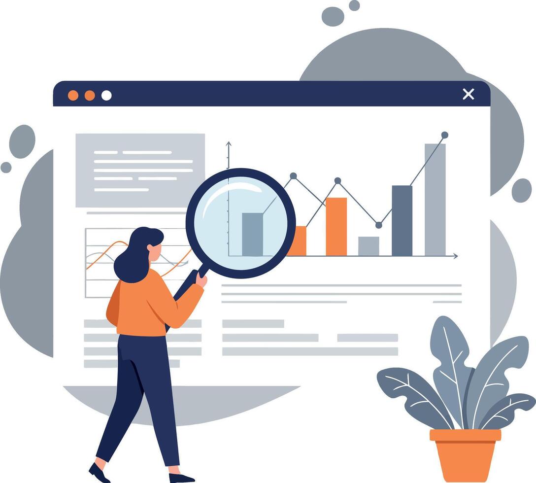 Woman analyzing data trends using a magnifying glass on a screen Pro Vector