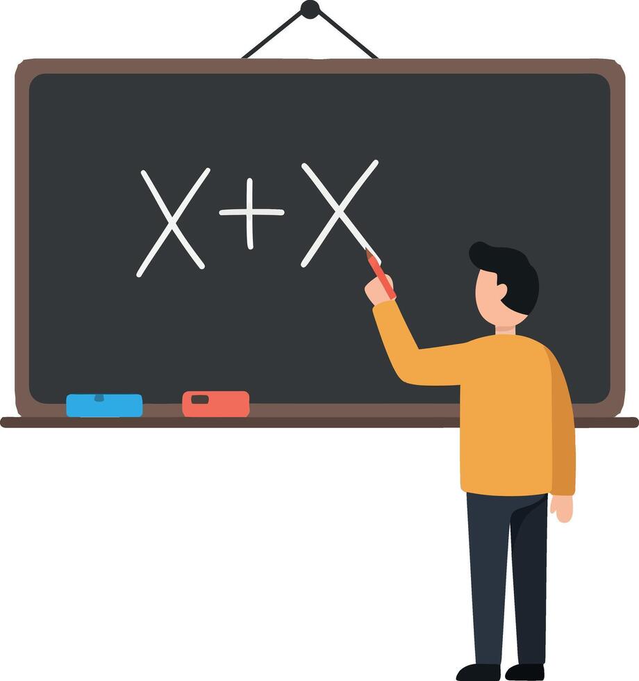Teacher explaining a mathematical equation on a chalkboard in classroom setting Pro Vector