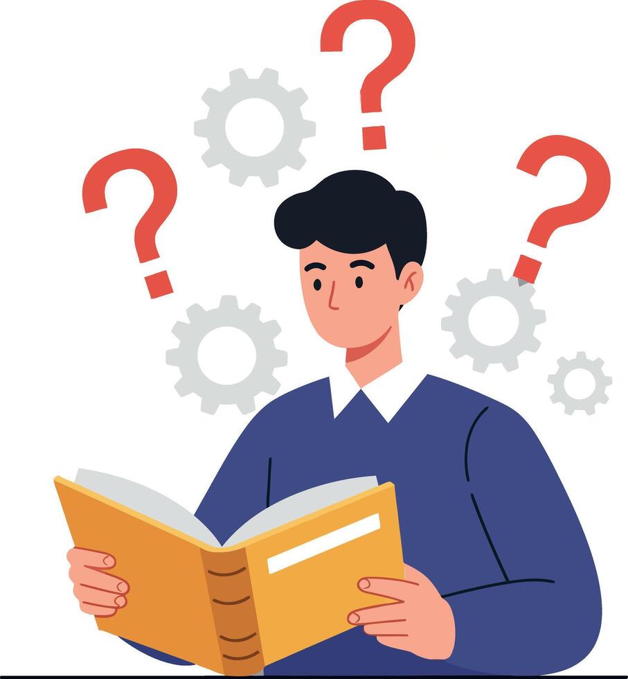 Person reading a book surrounded by question marks and gears representing confusion Pro Vector