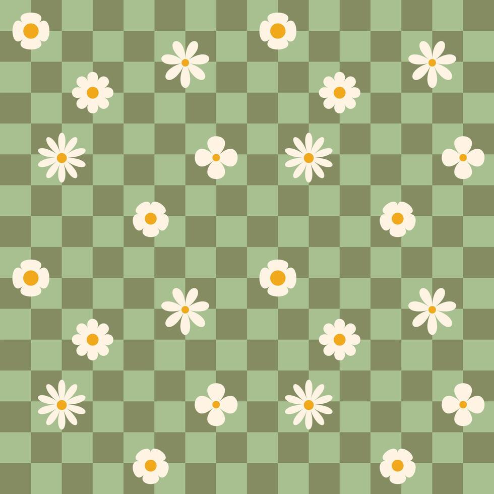 Green groovy flower checkerboard pattern. Retro seamless pattern with simple flowers in 1970s style. Groovy background for Tshirt, poster, card and print. Doodle Pro Vector