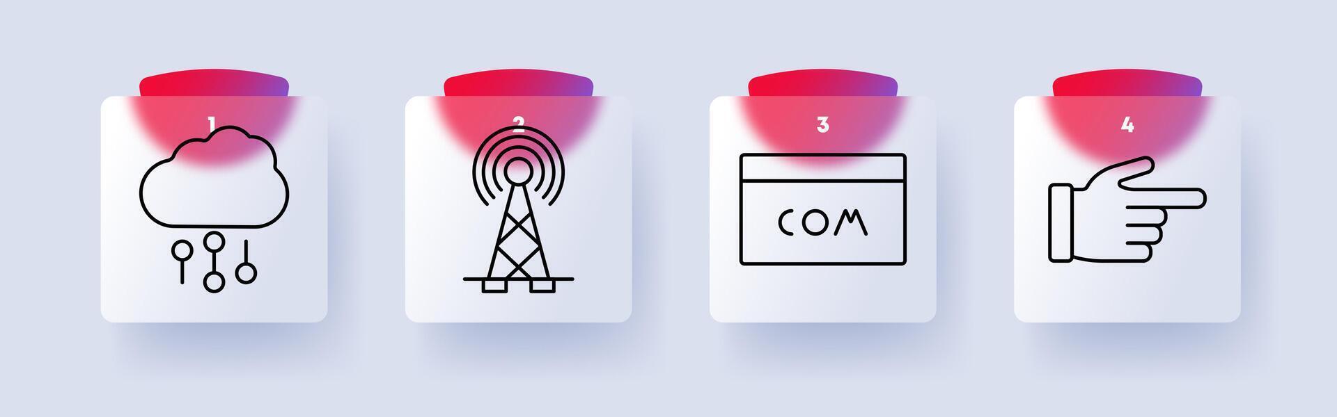 Technology and communication set icon. Cloud computing, antenna tower, domain name, pointing hand, internet services, data connection, online browsing Pro Vector