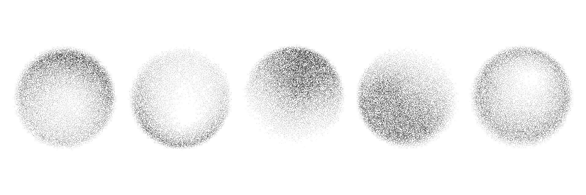 Black round stippled gradient set. Grunge circle dotted shadow collection. Radial noise texture brush pack. Halftone grainy sand diffuse shape bundle. Round spray patterns. Dotwork forms Pro Vector