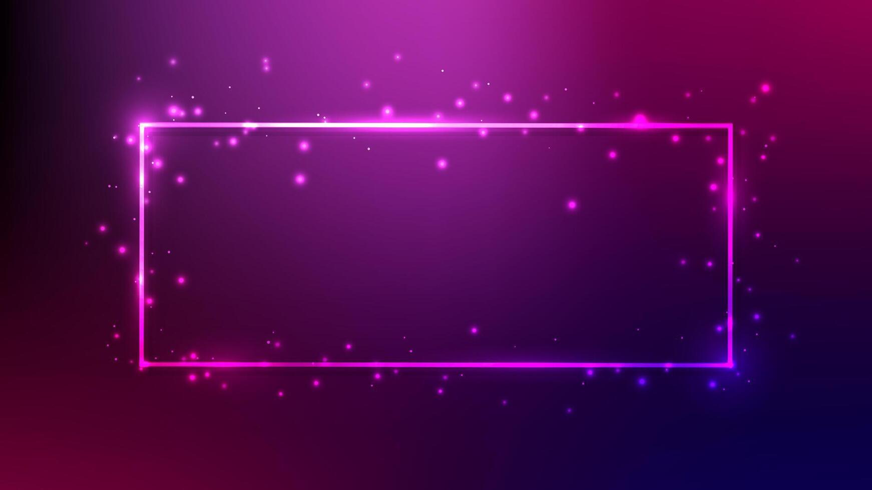 Neon rectangular frame with shining effects and sparkles on dark purple background. Empty glowing techno backdrop. illustration Pro Vector