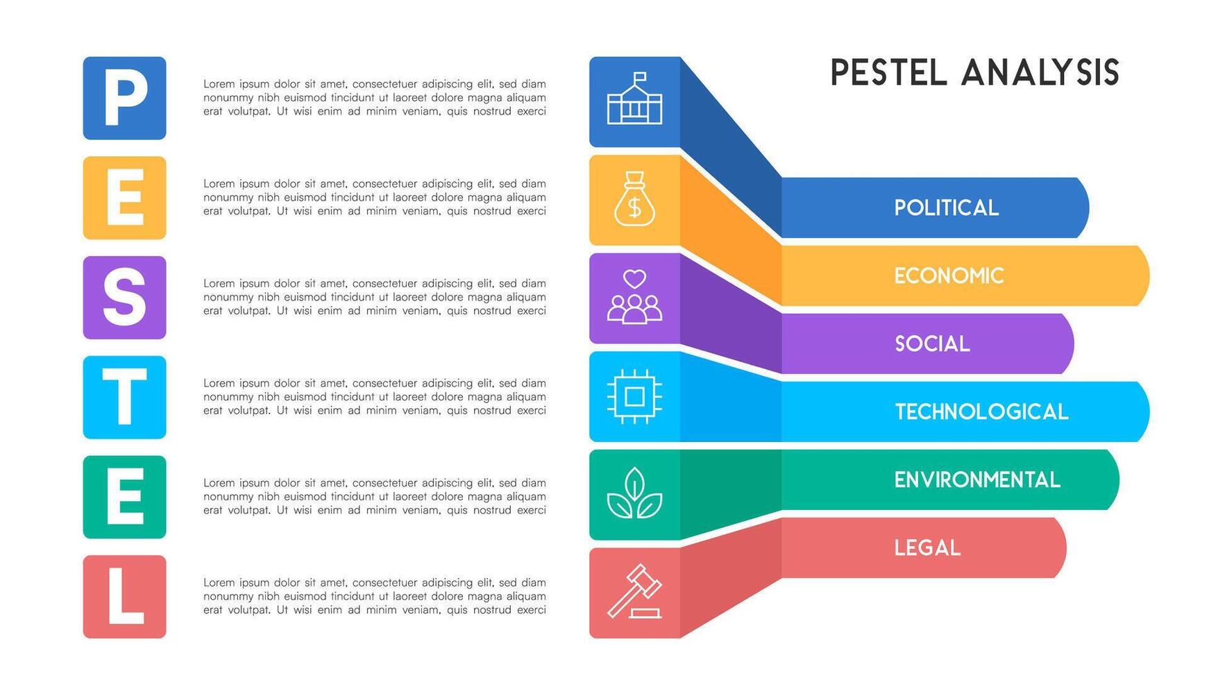 Flat Design PESTEL Analysis Infographic with Chevron Layout and Business Strategy Elements Pro Vector