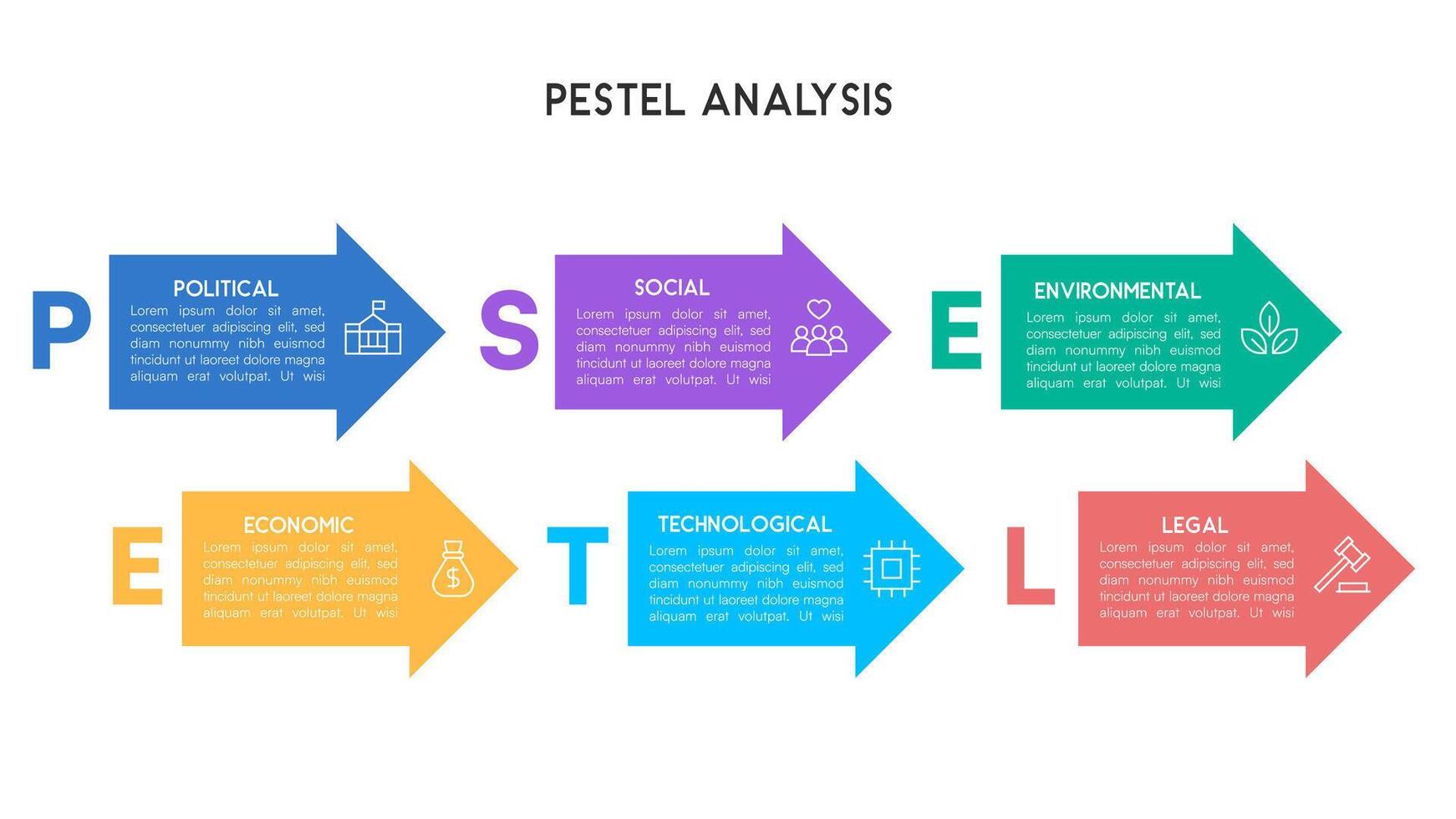 PESTEL Analysis Infographic with Rectangular Arrows in Sequential Flow for Business Strategy Pro Vector