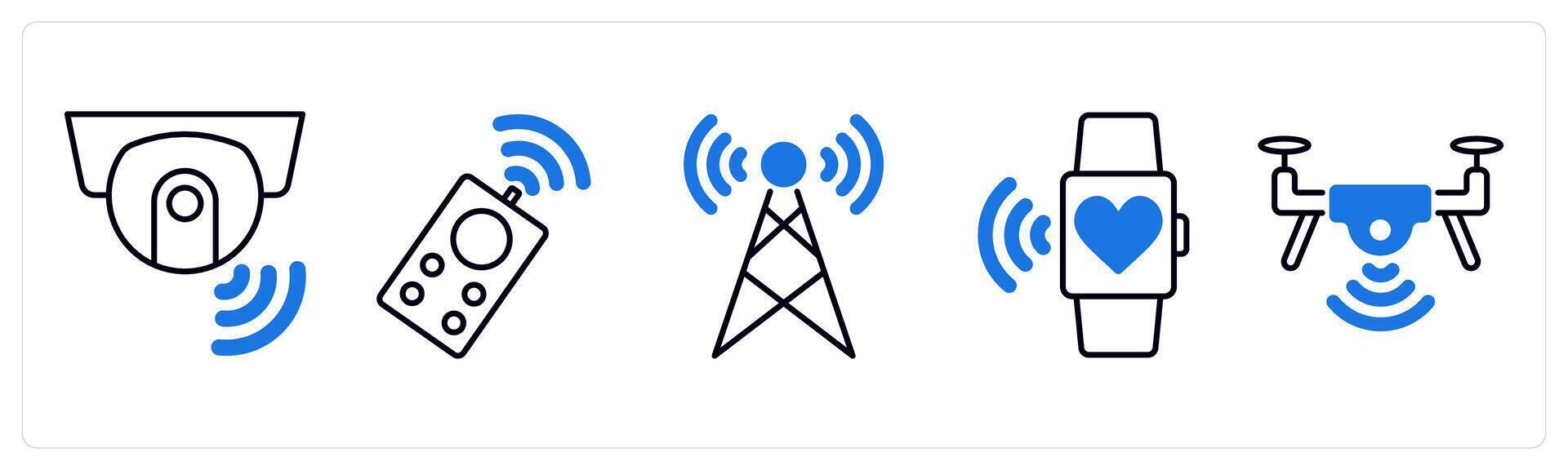 Set of 5 Technology icons as smart camera, remote control, signal tower Pro Vector
