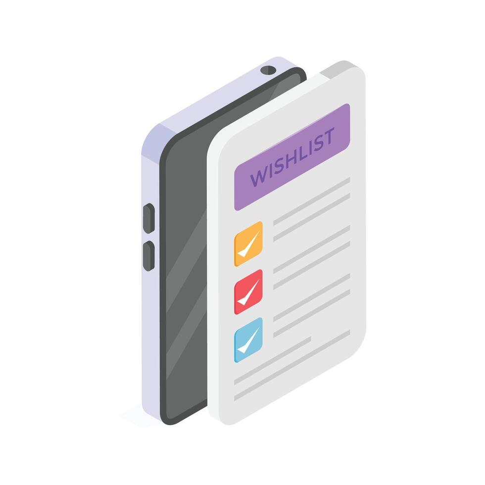 An isometric icon of a smartphone displaying a wishlist app. Pro Vector