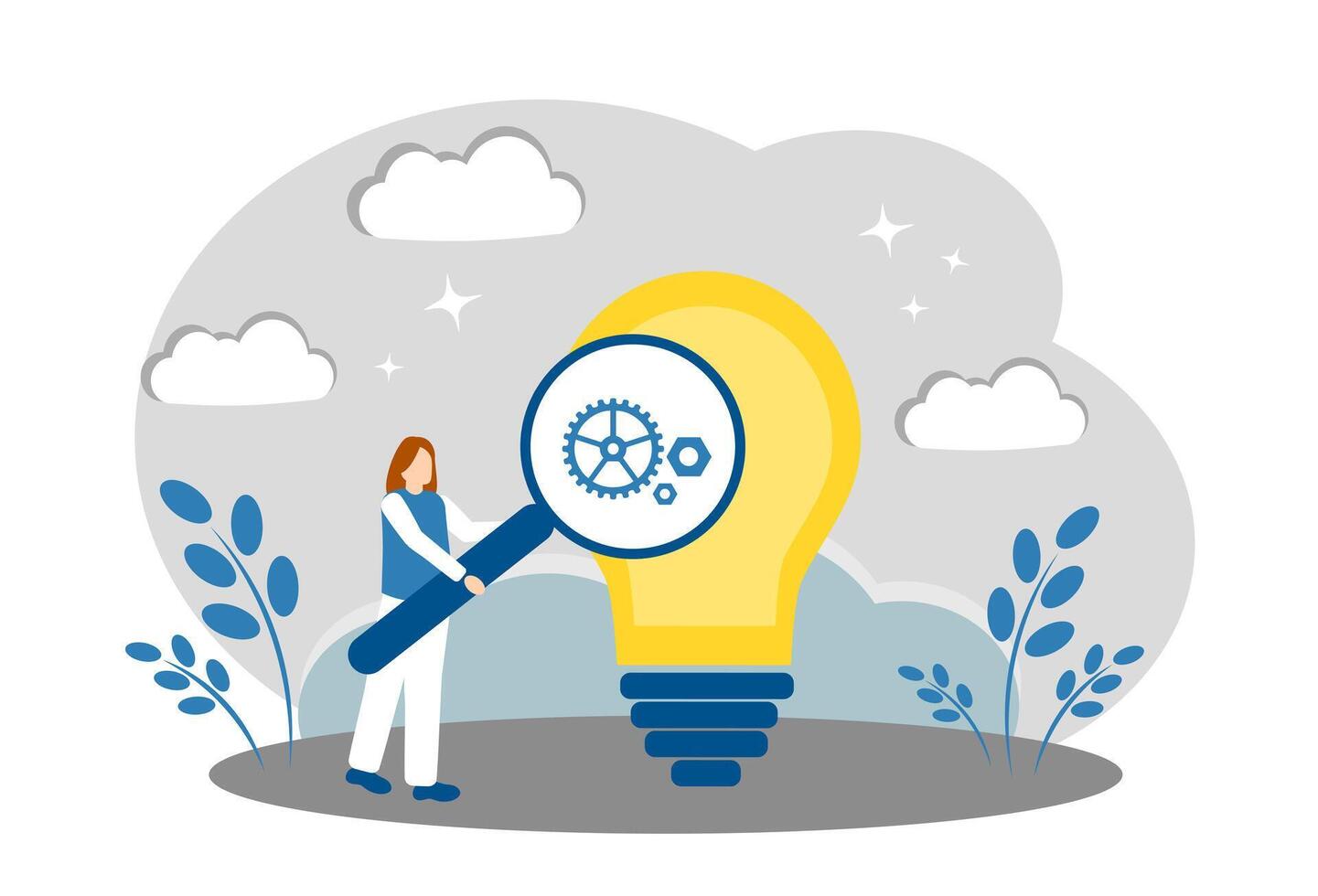 A woman, a light bulb, gears and a magnifying glass. The concept of finding a new idea and solving problems Pro Vector