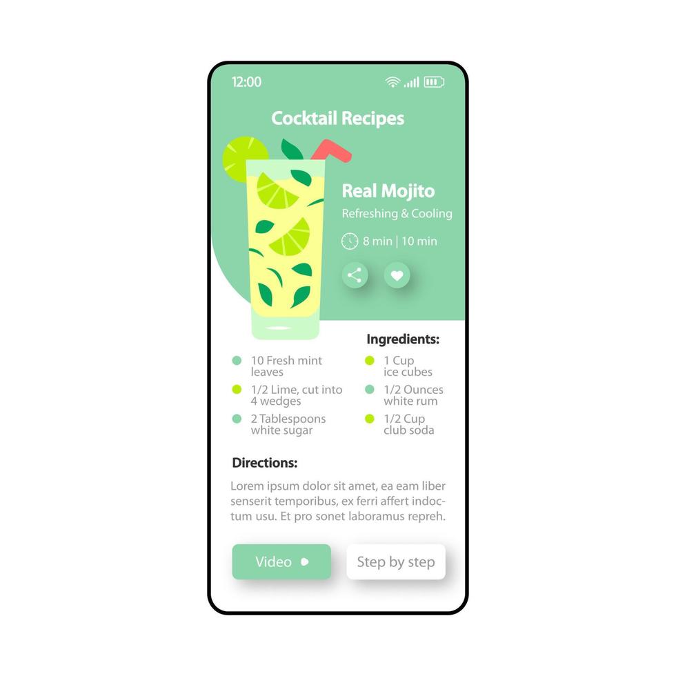 Cocktail recipes smartphone interface vector template. Mobile app page green and white design layout. Beverage preparation screen. Flat UI for application. Real mojito ingredients. Phone display Pro Vector