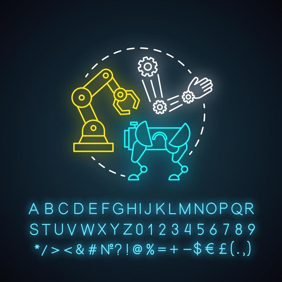 Dynamics and control neon light concept icon. Robotics motion system idea. Information technologies and innovative programming. Glowing sign with alphabet, numbers. Vector isolated illustration Pro Vector