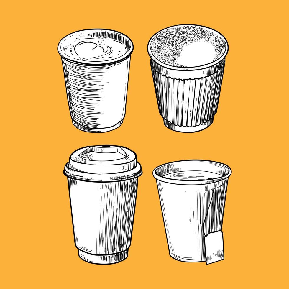 hand drawn paper cups with beverages such as tea, coffee, cappuccino. Heart on a foam. Drinks assets ready to use and easy to edit. Black outline and white fill in separate groups. Pro Vector