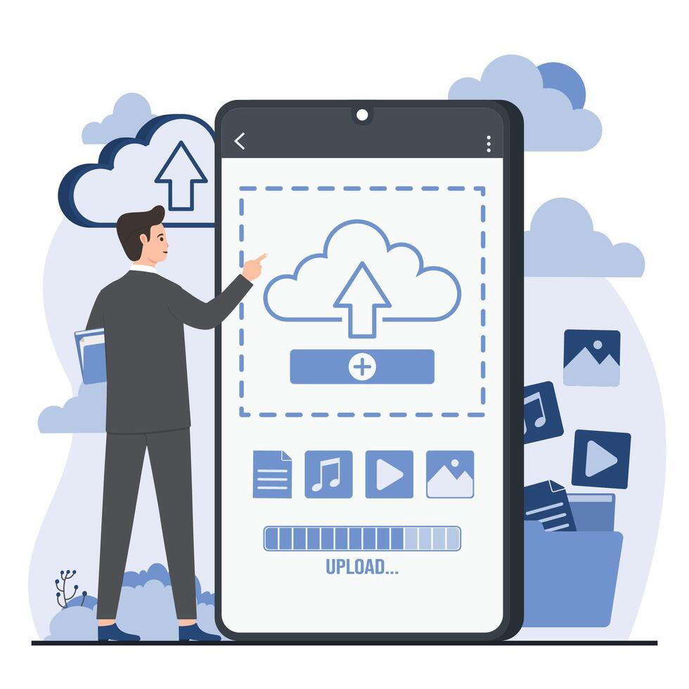 upload concept Cloud computing concept. illustration in flat style. Businessman with smartphone. Pro Vector