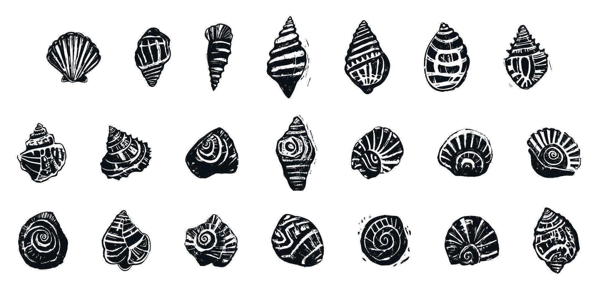 Set of linocut hand-drawn seashells in black ink style, featuring different shell species with intricate patterns and textures, isolated on transparent background Pro Vector