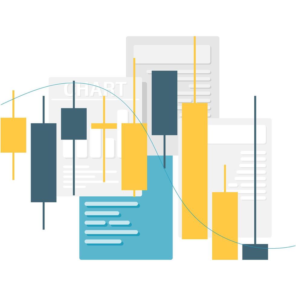 investment portfolio, candlestick in front of a stack of documents as a symbol of investment portfolio Pro Vector