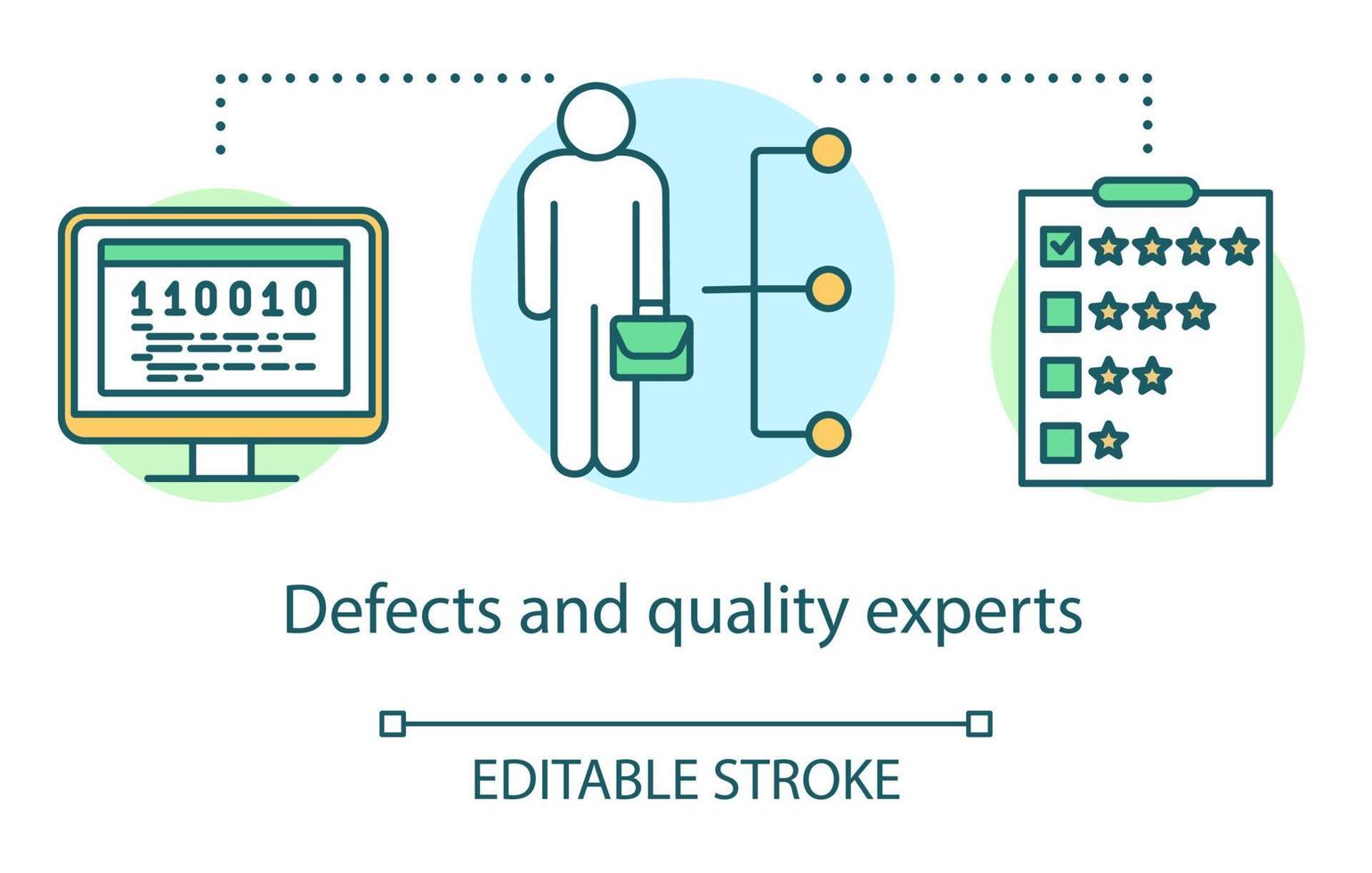 Defects and quality experts concept icon. Ratting IT idea thin line illustration. Software testing process. Indicating issues and problems. Vector isolated outline drawing. Editable stroke Pro Vector