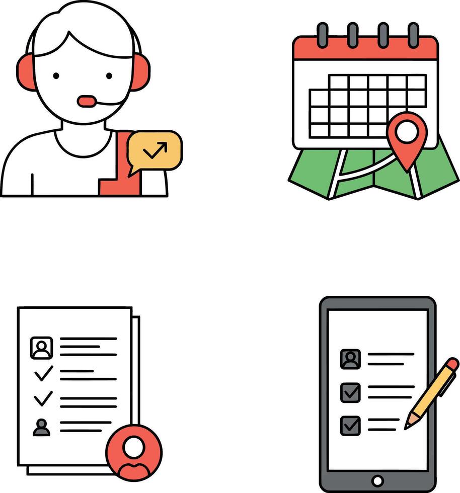 Customer service representative with headset, calendar icon, checklist document, and mobile device in flat art Pro Vector