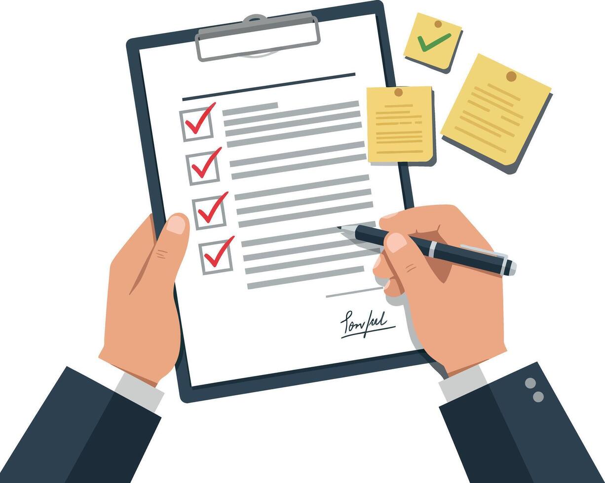 Hands holding a clipboard with checklists and notes in a flat illustration style Pro Vector
