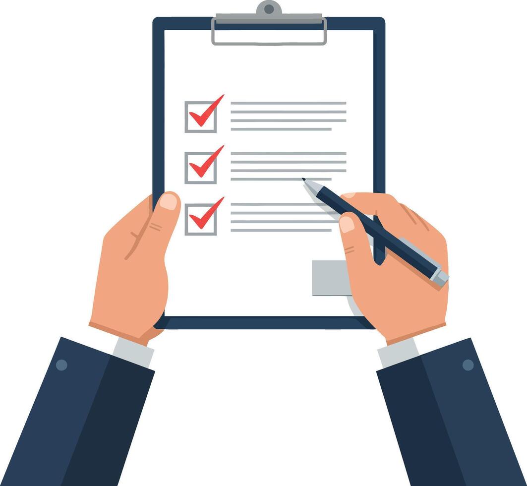 Hands holding a checklist with checked boxes in a minimal, flat design illustration Pro Vector