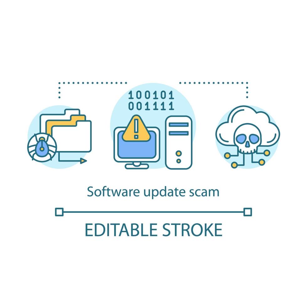 Software update scam concept icon. Cyber attack idea thin line illustration. Internet crime, fraud. Computer hacking. Bugs and virus. Vector isolated outline drawing. Editable stroke Pro Vector