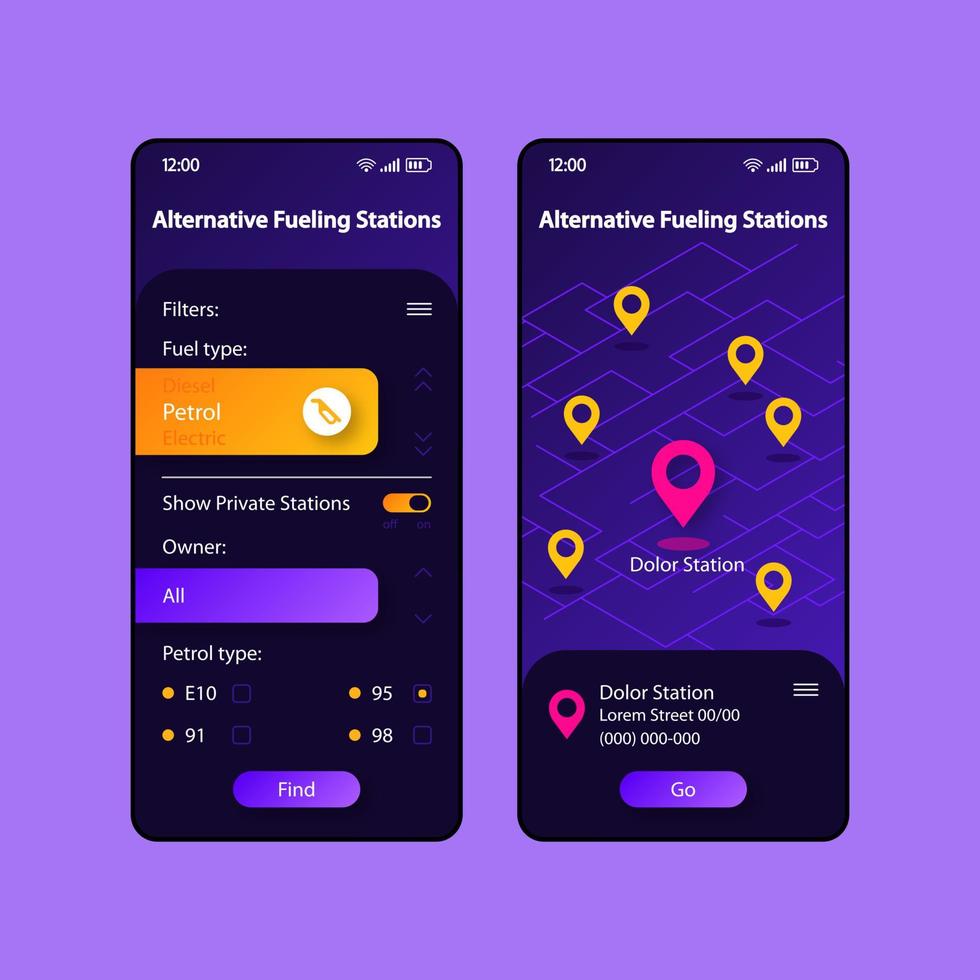 Alternative fueling stations smartphone interface vector template set. Mobile app page dark blue and black design layout. Gas station map screen. Flat UI for application. Navigator. Phone display Pro Vector