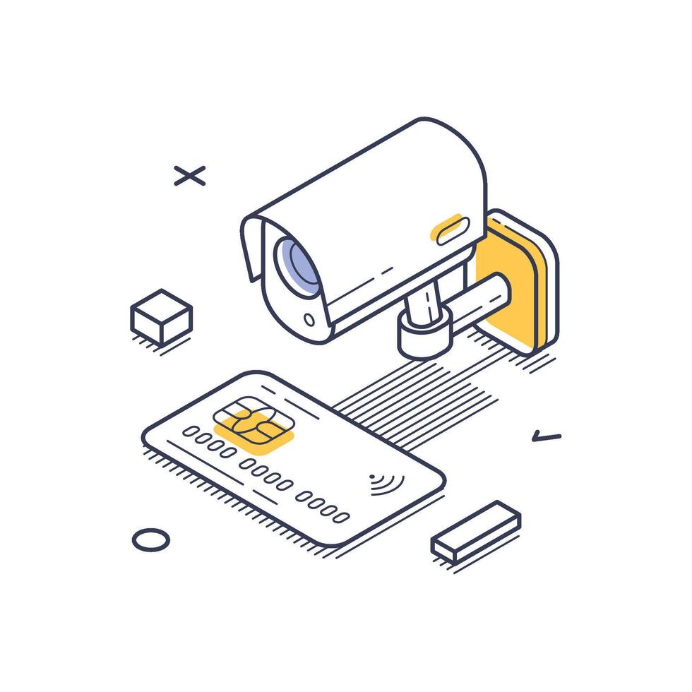 Isometric line art icon representing internet security with surveillance and payment card elements Pro Vector