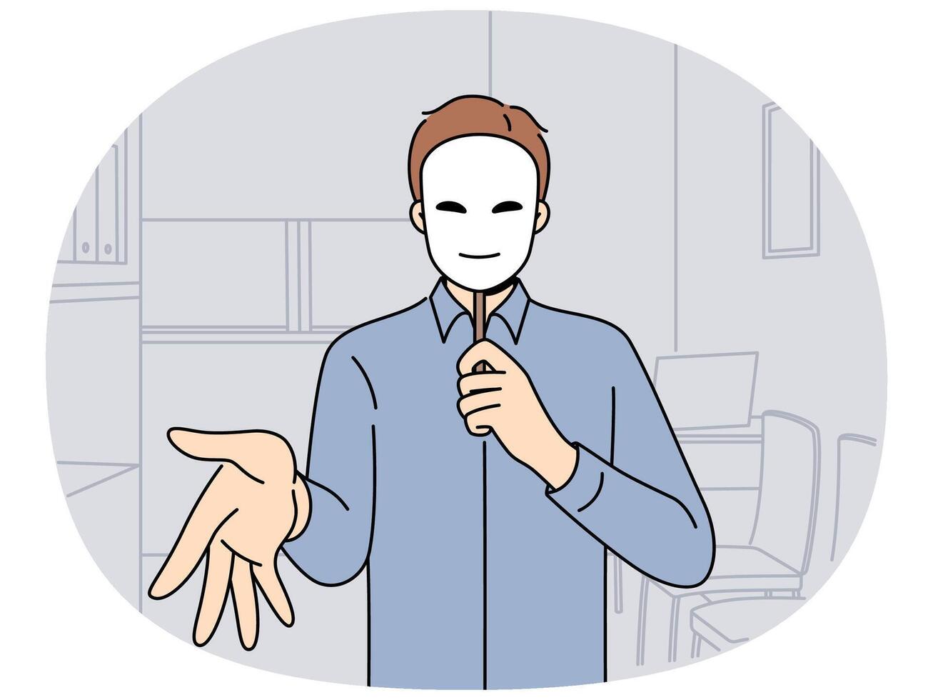 Man manager in mask extends palm for handshake, for concept deception and hypocrisy in business Pro Vector