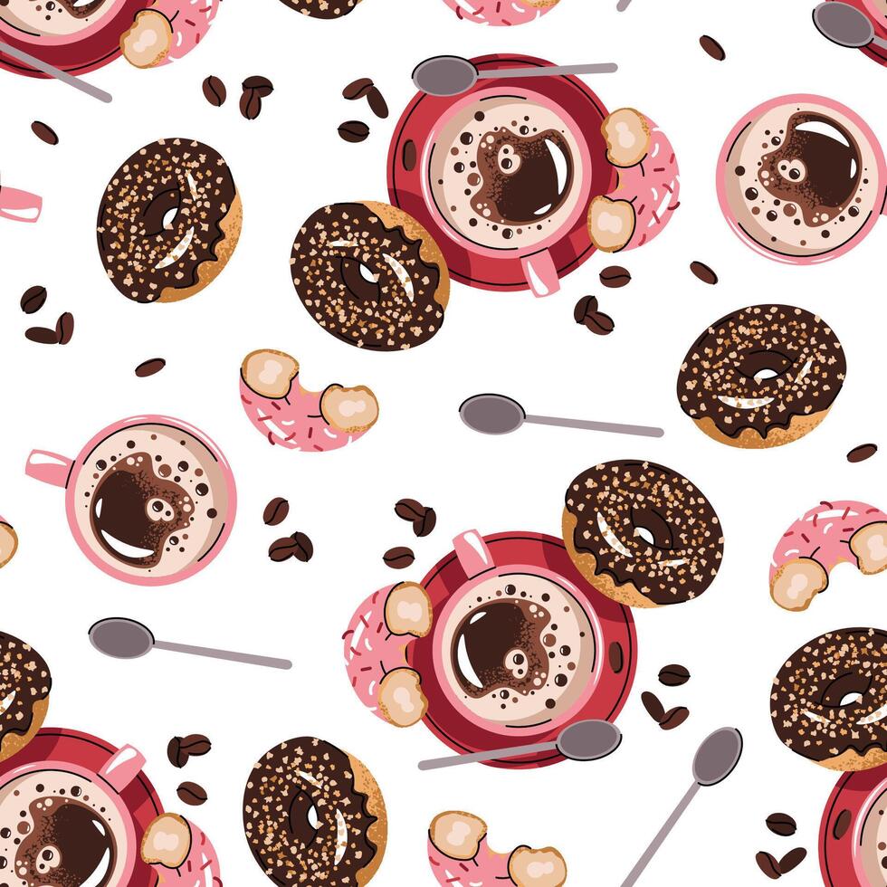 Seamless pattern with a cup of coffee and a donut. Repeating texture with a coffee drink and dessert. Coffee time. Suitable for textiles, wallpaper, paper, etc. Pro Vector