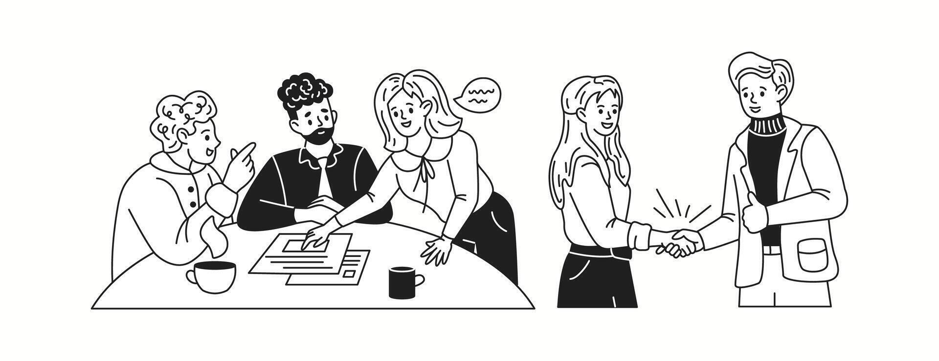 Business team discussing project linear icons collection. Office workers greet handshaking solving work tasks doodle characters set on white background Pro Vector