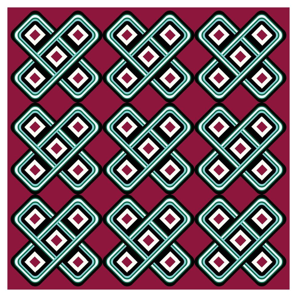 A repeating geometric square shape print pattern featuring intertwined shapes in real, black, and white on a deep maroon background. Pro Vector
