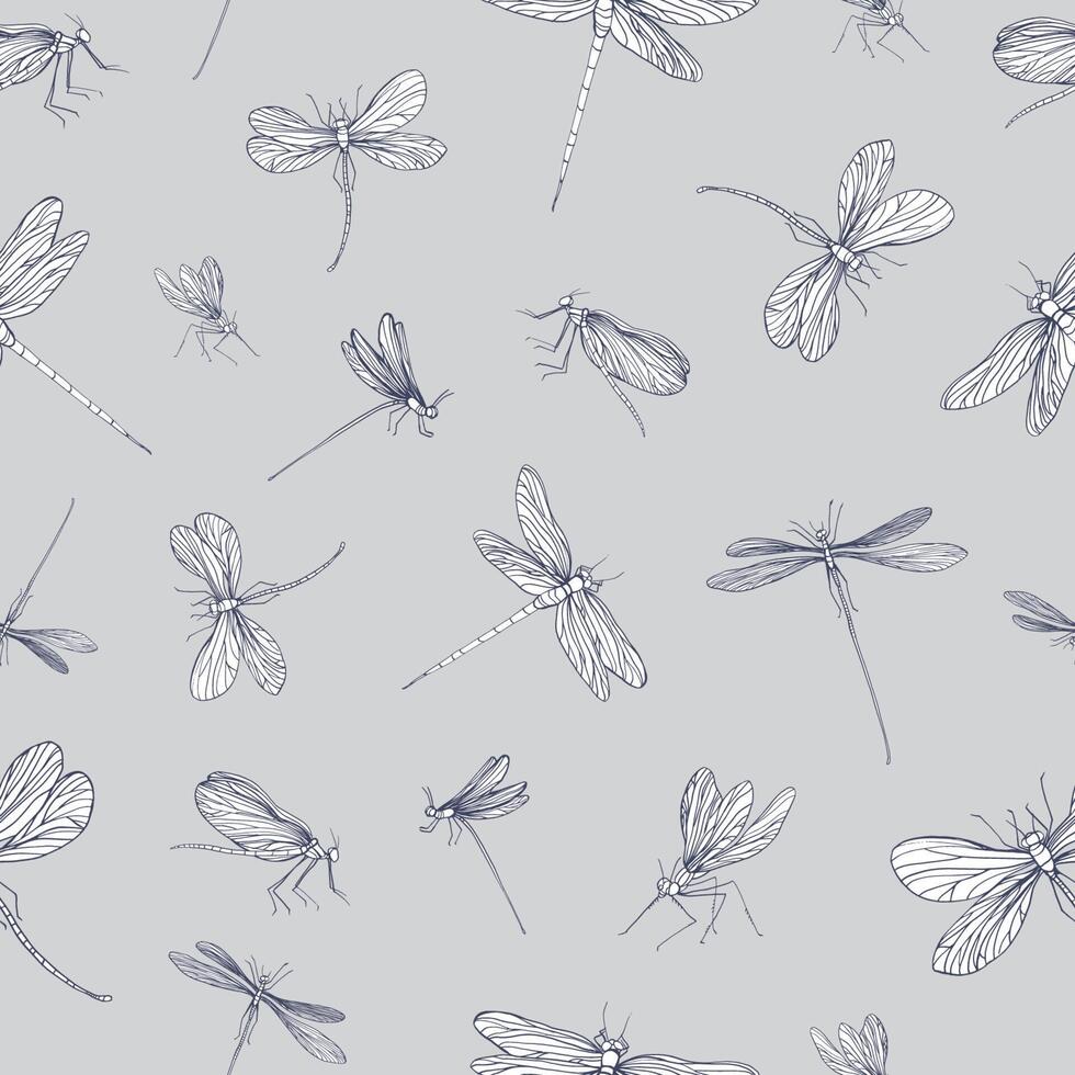 Seamless pattern with dragonflies hand drawn with contour lines on grey background. Backdrop with beautiful flying insects. illustration in elegant style for textile print, wrapping paper Pro Vector