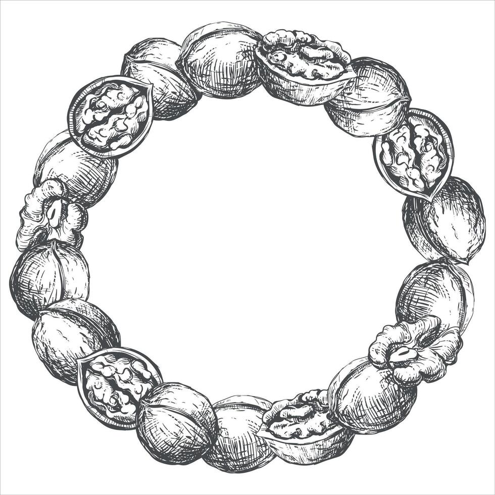 round frame of walnuts. Wreath of open walnut kernel, whole walnut. Design for packaging of nut paste, liqueur or oil. Black and white sketch isolated on white background. Engraving style, ink. Pro Vector