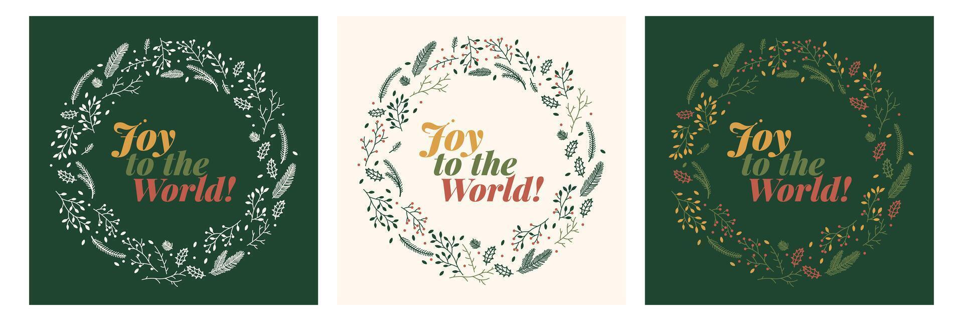 square visuals with minimalist branches and leaves and Joy to the World text. Pro Vector
