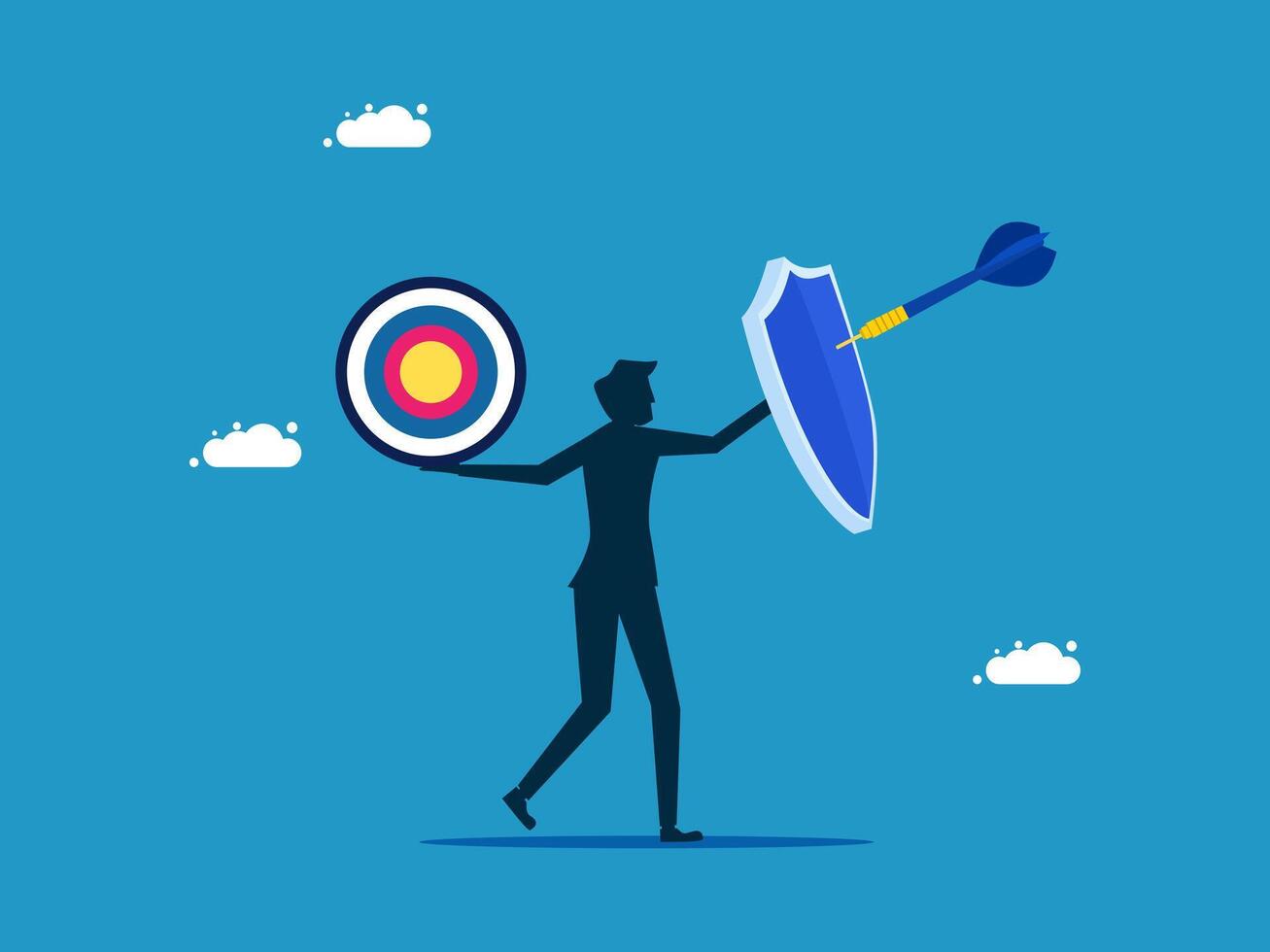 man holding shield and arrow with target on blue background Pro Vector