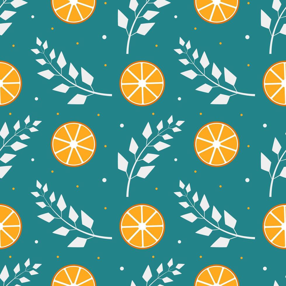 Seamless pattern with oranges and leaves on a turquoise background Pro Vector