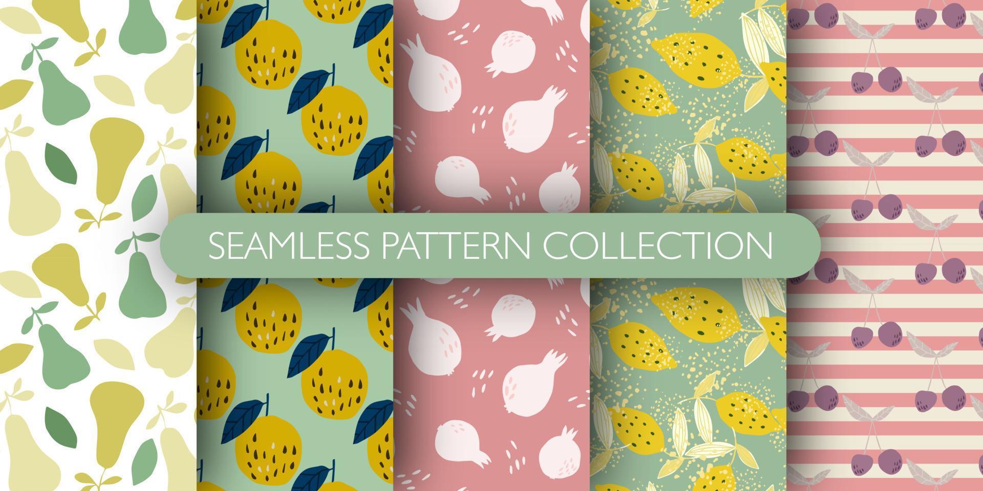 Set of fruits seamless pattern. collection of patterns - lemon with leaves, pomegranate, cherry, pear, apple. Pro Vector