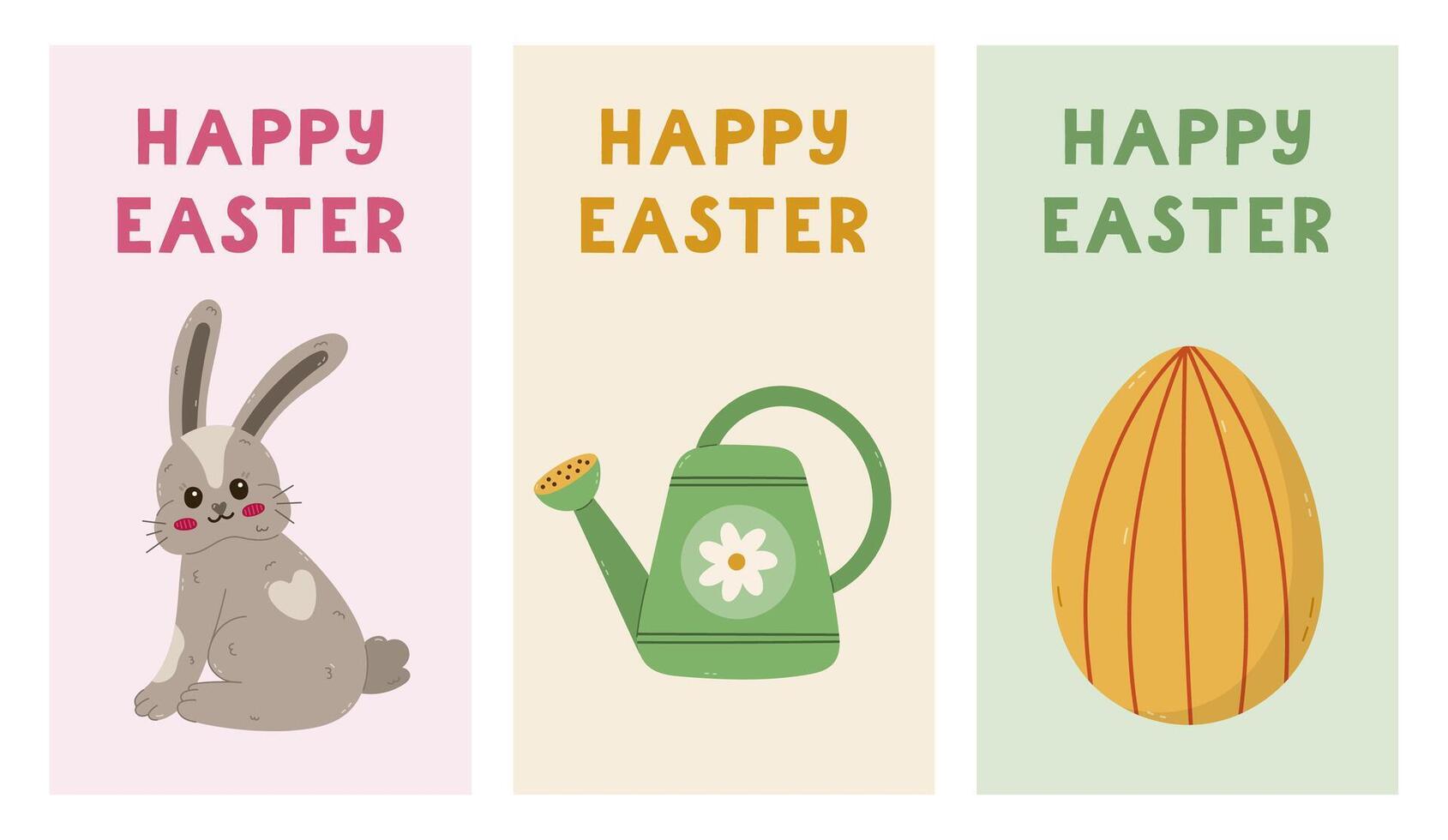 Lovely simple set of vertical Happy Easter posters with bunny with heart on fur, Easter egg with lines, watering can. Simple collection of spring banner, cover, background with colourful clipart. Pro Vector
