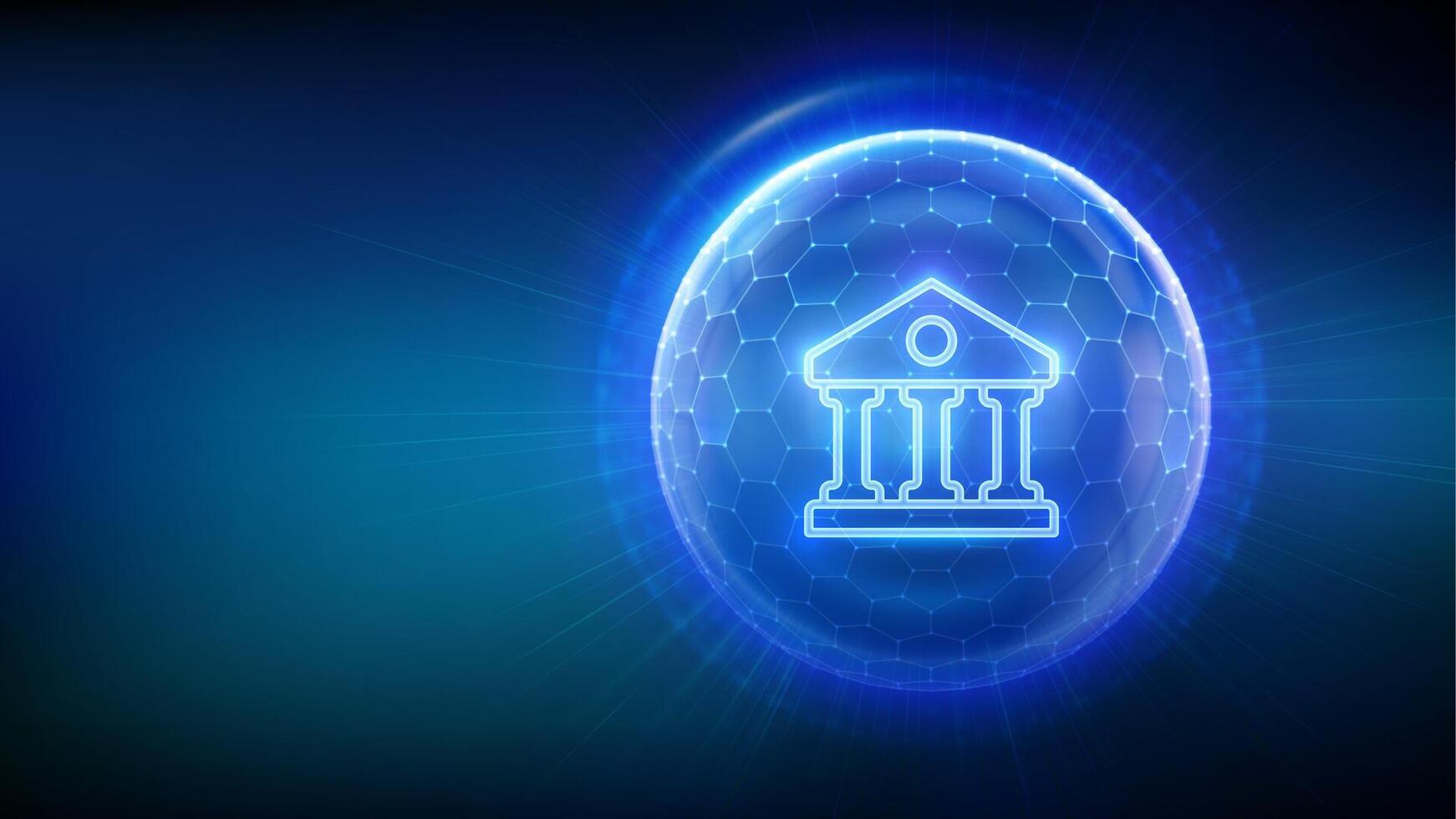 Banking. Online banking and payment. Secure transactions. Financial data protection. Cyber security. Finance networking. Glass transparent sphere with surface of hexagons with Bank icon Pro Vector