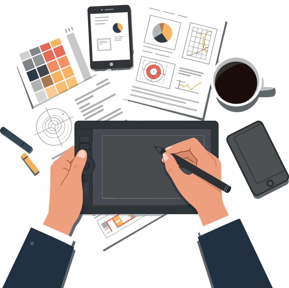 Hands holding a digital tablet sketching designs with various tools and documents in a flat minimal illustration Pro Vector