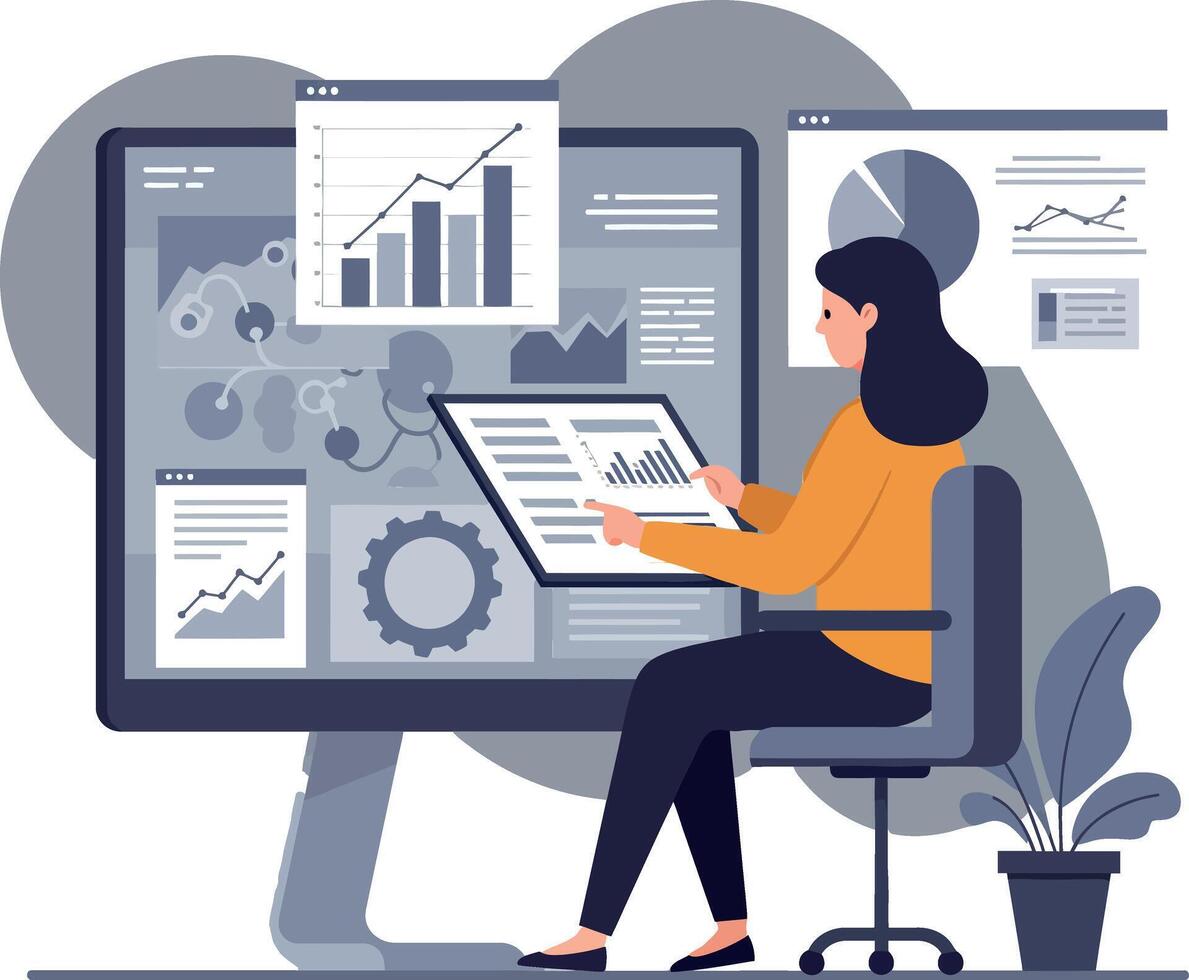 A woman analyzing data on a large computer screen in a minimalistic workspace with abstract graphs and charts, modern illustration Pro Vector