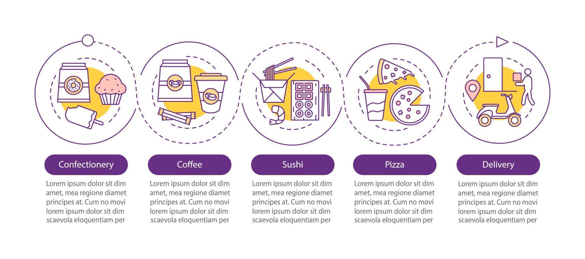 Food delivery vector infographic template. Confectionery, coffee, sushi and pizza delivery. Data visualization with five steps and options. Process timeline chart. Workflow layout Pro Vector