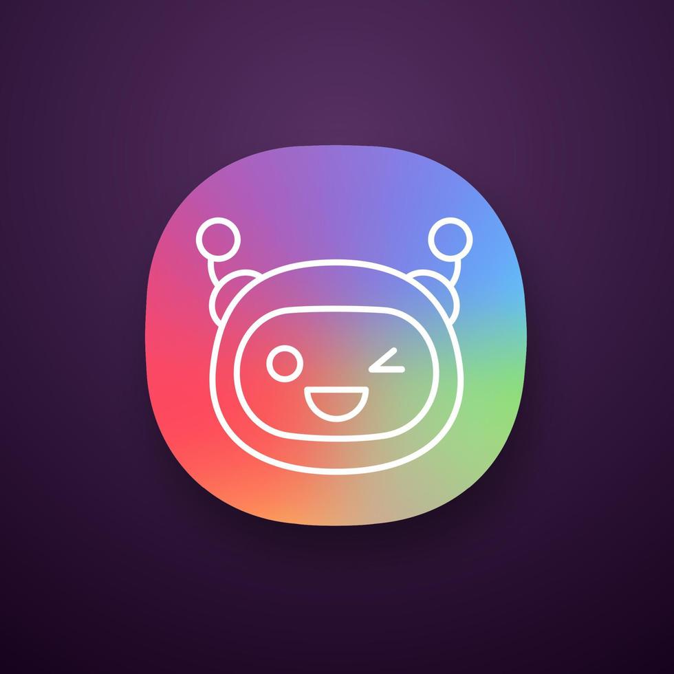 Winking robot emoji app icon. Happy and funny chatbot smiley. UI UX user interface. Web or mobile application. Chat bot emoticon. Artificial intelligence. Vector isolated illustration Pro Vector