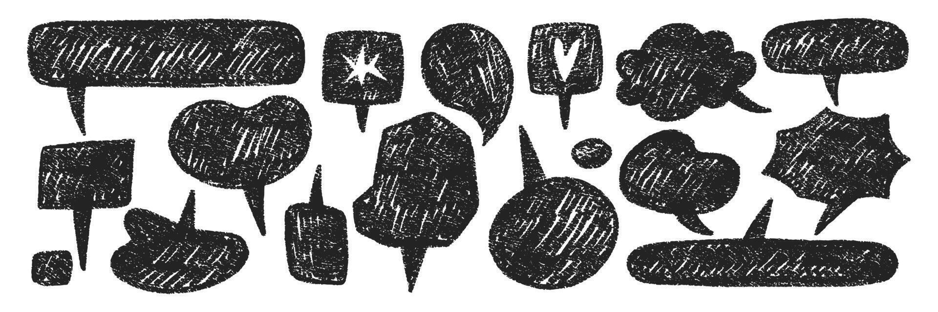 Set of speech bubbles drawn with chalk and crayon. Text boxes for conversation or dialog in sketch style. illustration. Pro Vector