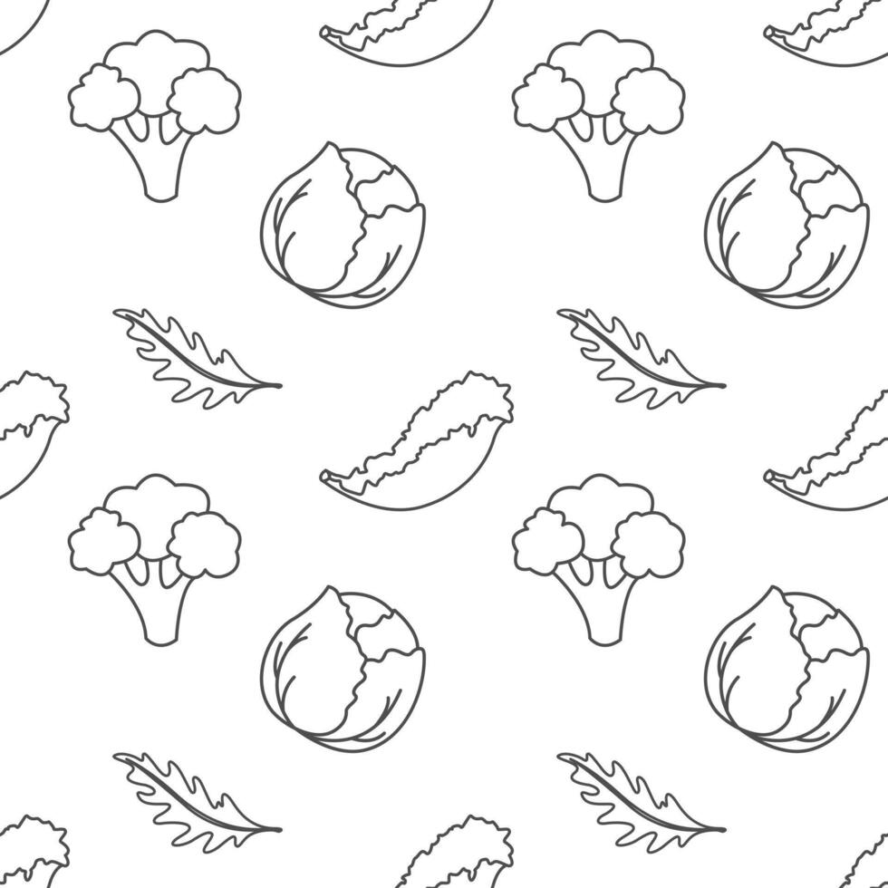 Seamless pattern with cabbage, arugula, broccoli and salad outline contour drawing on white background. Pro Vector