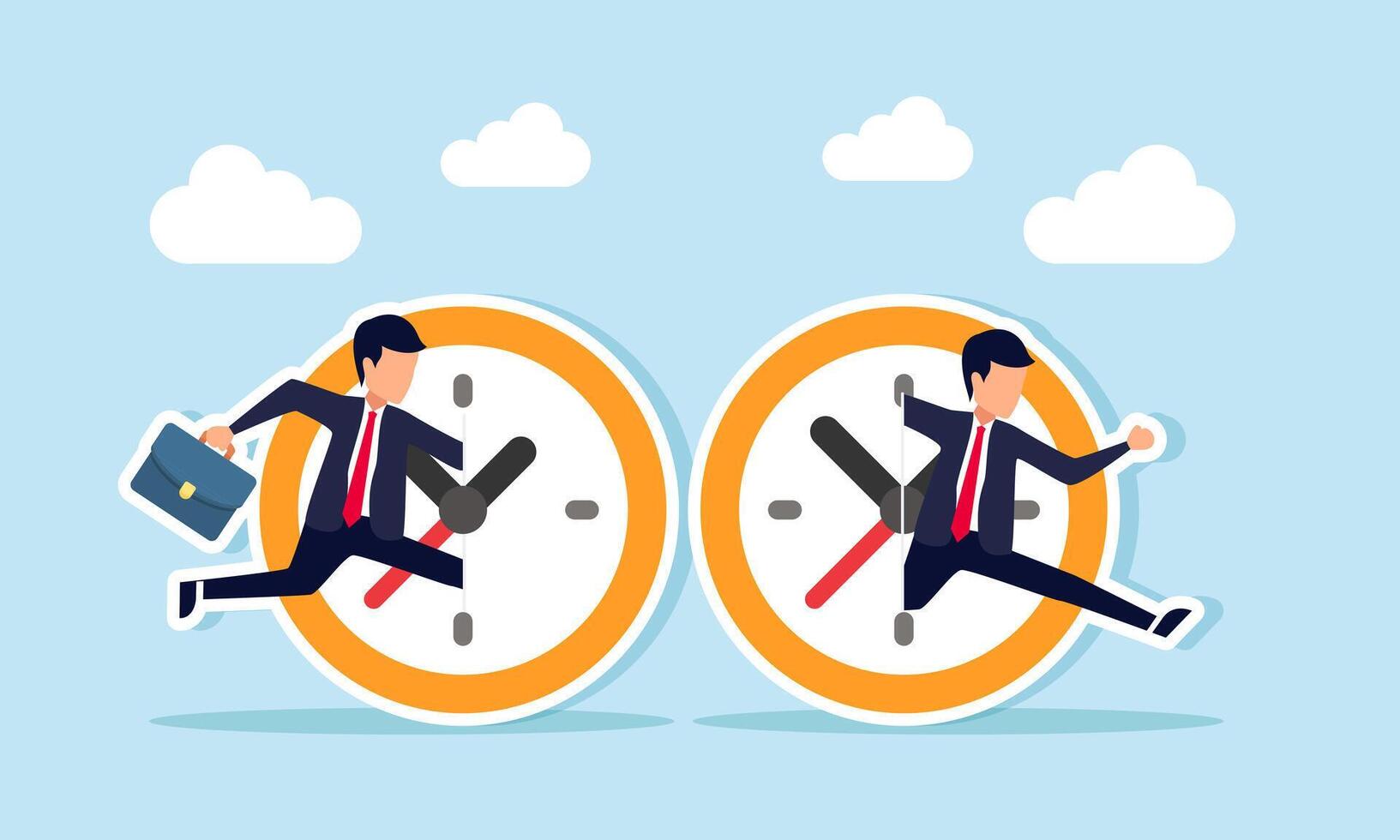 Businessman passes through a time portal inside a clock, illustration of strong multitasking ability and efficient time management Pro Vector